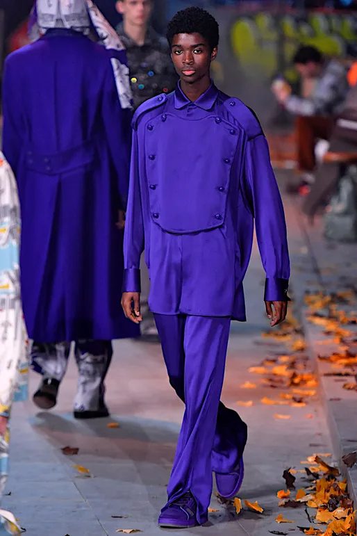 LOUIS VUITTON 2019 秋冬系列播放着 Michael Jackson的翻唱歌曲,Virgil Abloh 以白手套、装饰着徽章的羊毛外套、紫色套装等造型致敬黑人乐坛天王 Michael Jackson 和 Prince。