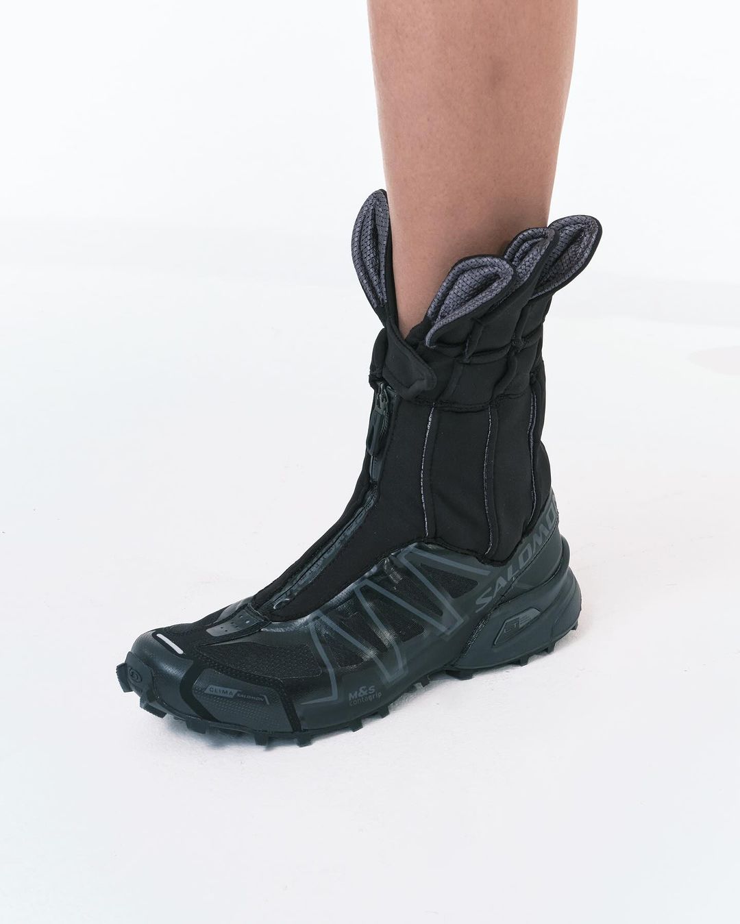 2021 年才成立的 JUNTAE KIM,能够迅速获得不俗的关注量与人气,正是得益于其在时装立体结构和跨次元般意境层面的独特设计理念;此番颇为出圈的合作,这一美学语言在主流鞋款上得到再度诠释,也足可见 Salomon 对其给予了极大程度的创作自由。