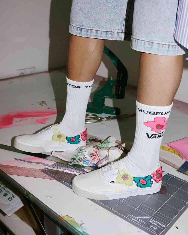 VANS 与擅长活泼趣味艺术画风的韩国时装品牌 The Museum Visitor,同样也有着可圈可点之处。Authentic、Classic Slip-On、Sport Low 三双主力鞋款的权限开放,对于 The Museum Visitor 这一暂时还算不上大范围知名的品牌来说,已是足够诚意的规格体现;艺术画笔触的油墨晕染、俏皮感十足的立体花卉刺绣等设计手法,也显然证明 The Museum Visitor 在这次合作中,被赋予了足够的创作发挥空间。