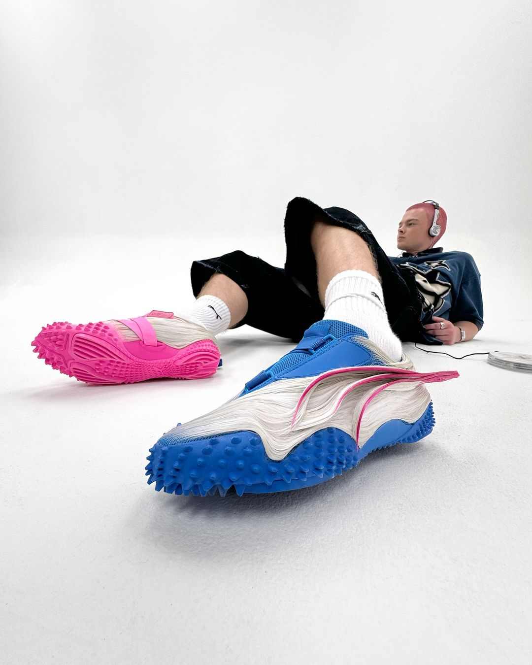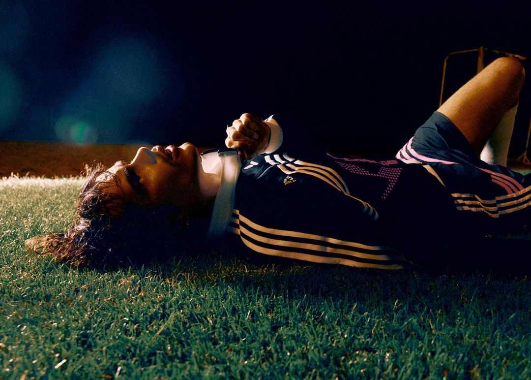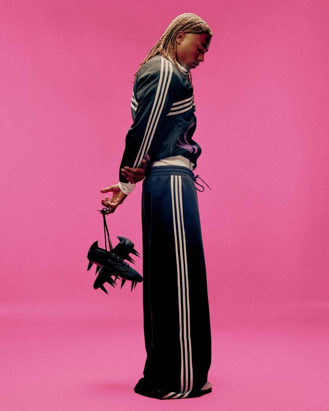 令人吃惊的不止是 adidas 突然为客制系列背书的做法,还有该行为同时也意味着 adidas 有意将这次的激进画风展现给数量庞大的普通消费者。超短 Beckenbauer Tracksuit,男士紧身 Tank Top,尖刺足球包,超长足钉的足球鞋以及 Logo、条纹和拍摄置景中都反复出现的亮粉色,不管是从廓形,配色选择还是型录拍摄,该系列所展现出来的强烈视觉效果无疑都有着向亚文化着装范畴靠拢的迹象。