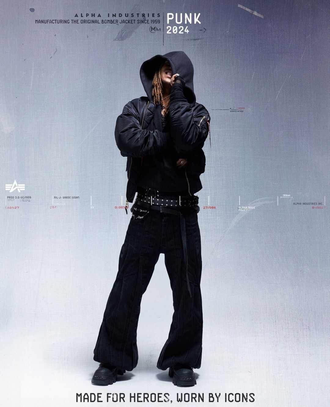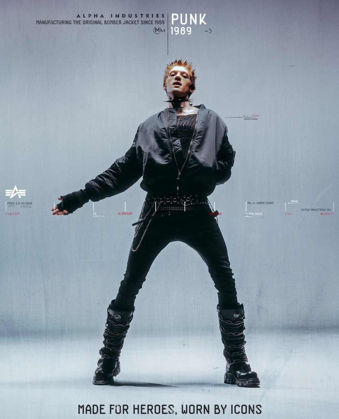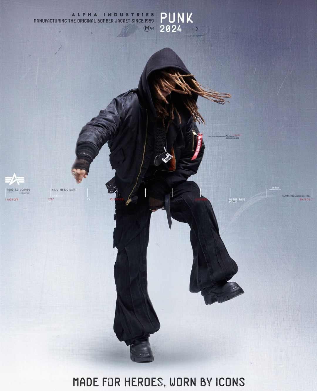 除了为客制合作背书的 adidas,近期还有另一个品牌开始拥抱起了亚文化根源 —— Alpha Industries。这个成立于 1959 年的美国服装品牌通过一支围绕经典版型 MA-1 夹克的广告「Made For Heroes, Worn By Icons 为英雄而制,为时尚偶像所穿」,完成对亚文化致敬的同时,也以官方的姿态展现了与这些小众文化融合后的形态。