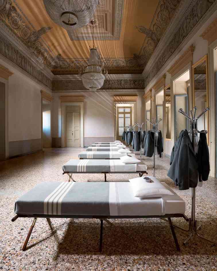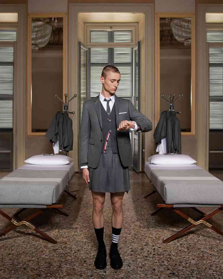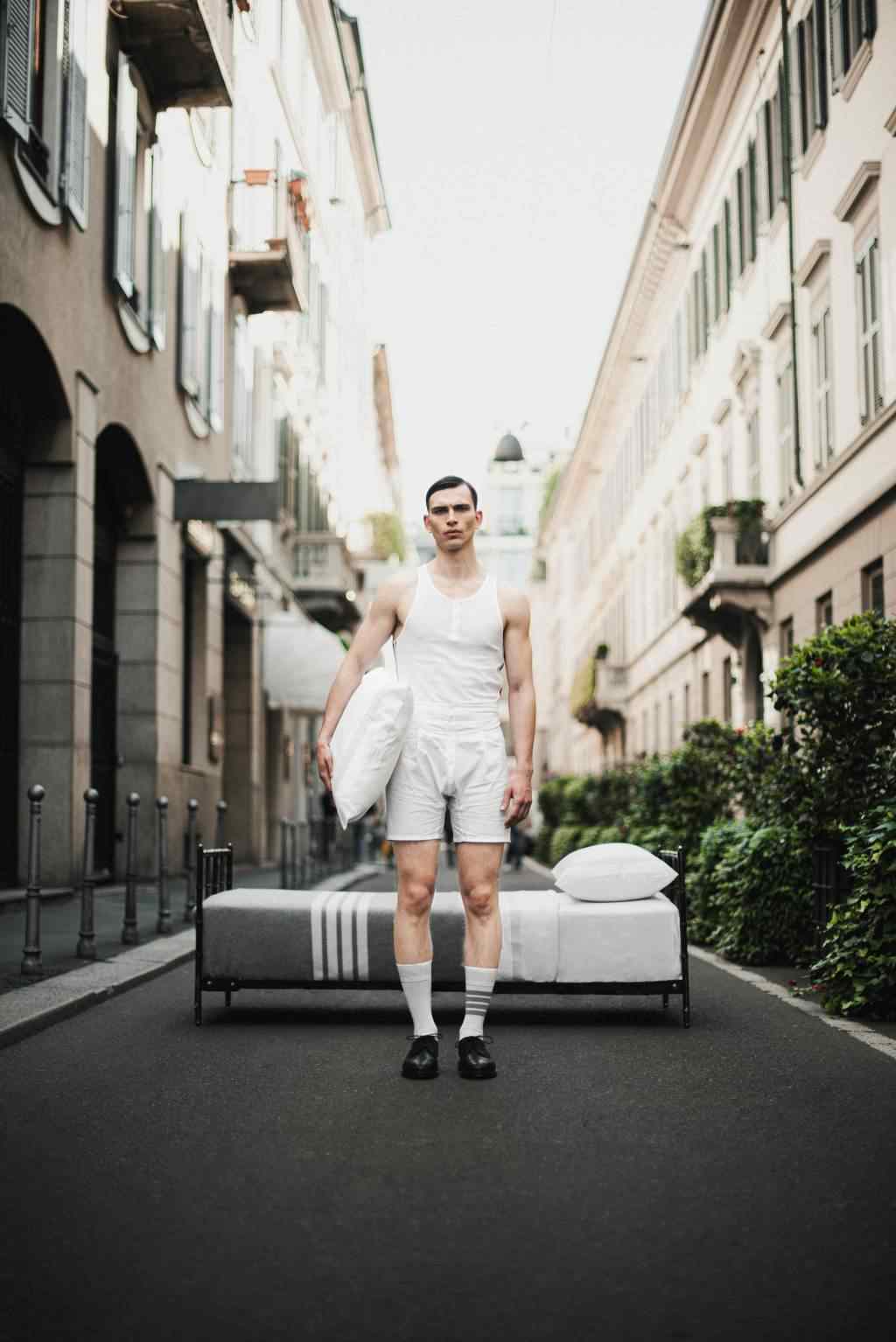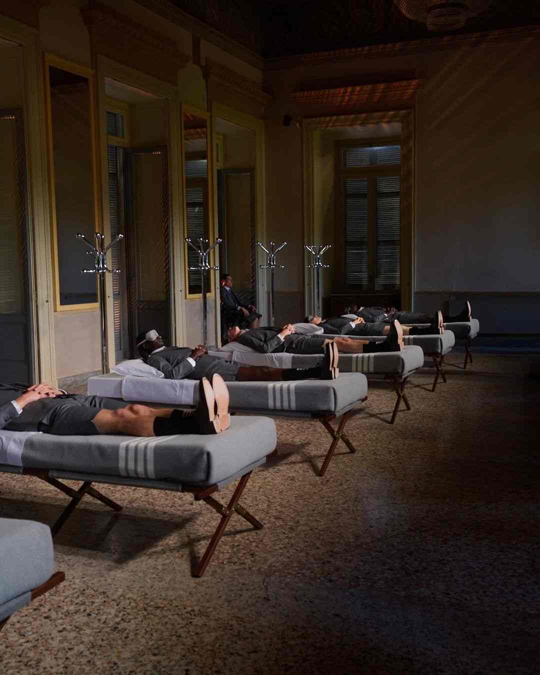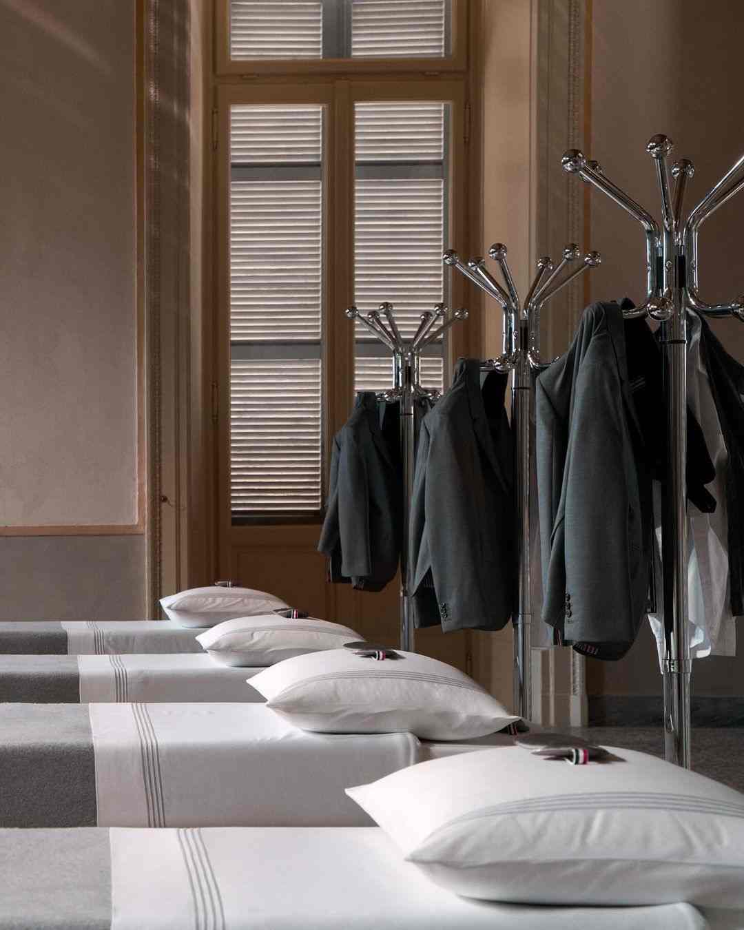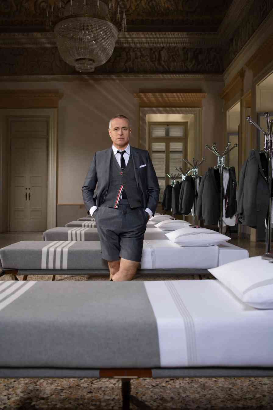在 2021 年,Stüssy 与 Tekla 的首次合作就将街头潮流延伸到了寝室的床上用品,但今年无论是街头品牌还是高阶设计师品牌将这一类合作抬升到了更高的质感维度。Thom Browne 就在不久前声势浩大地曝光了与百年家居单位 Frette 的合作系列,甚至专门在米兰阿皮亚尼宫策划演出,释出了一系列寝室床上用品与浴室用品,Thom Browne 品牌经典四道杠与灰色系贯穿始终,Thom Browne 本人也亲临现场,营造出不只是 Wear Like Thom Browne,更要 Live Like Thom Browne 的氛围。