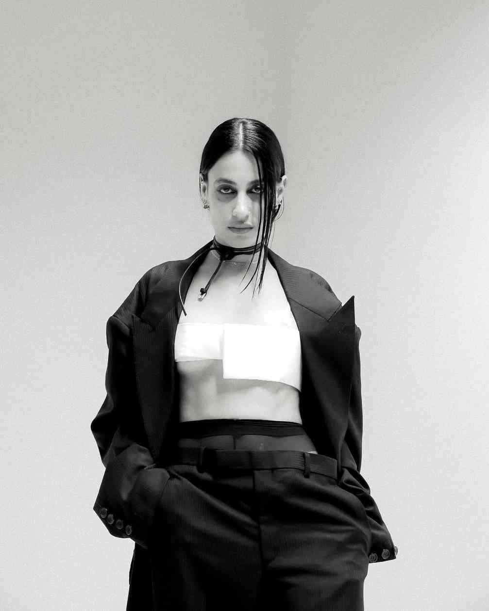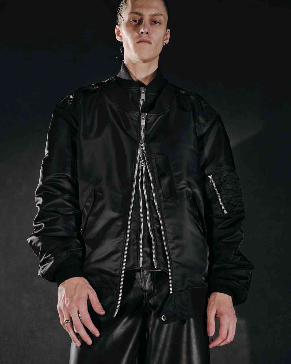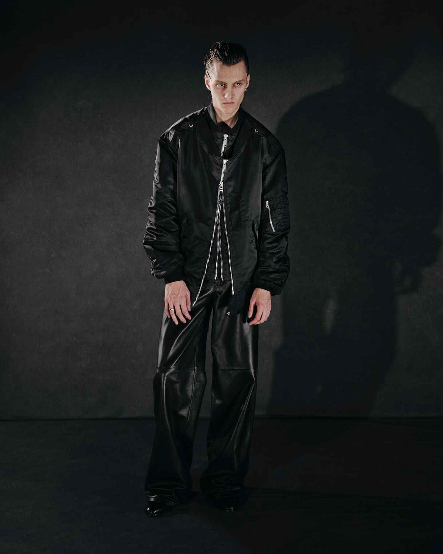 而女装则是将皮革束带、项圈以及内衣等亚文化中常见的元素与夹克或裙装相结合,呼应本次主题的禁忌神秘感。纵观 JOHN LAWRENCE SULLIVAN 的 2025 春夏系列,其实某种程度上也是此前「Stacking」主题系列的延伸,继续挖掘后朋克时代文化。
