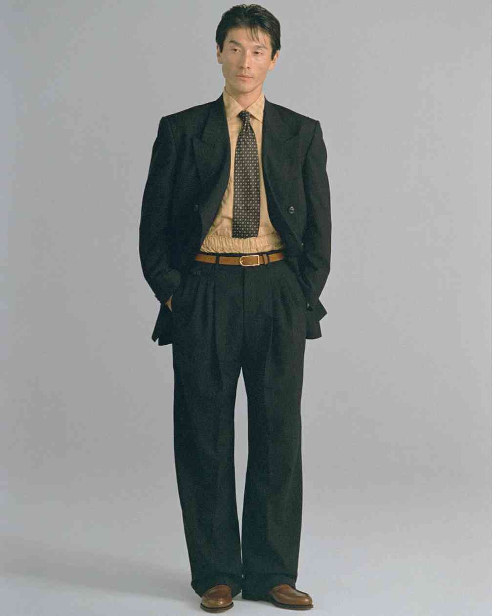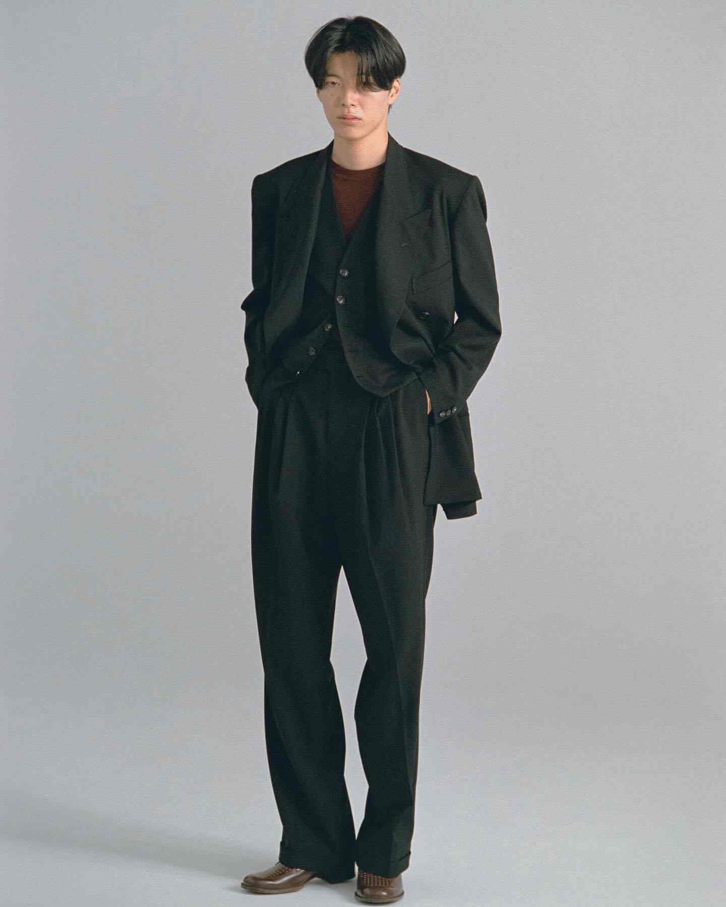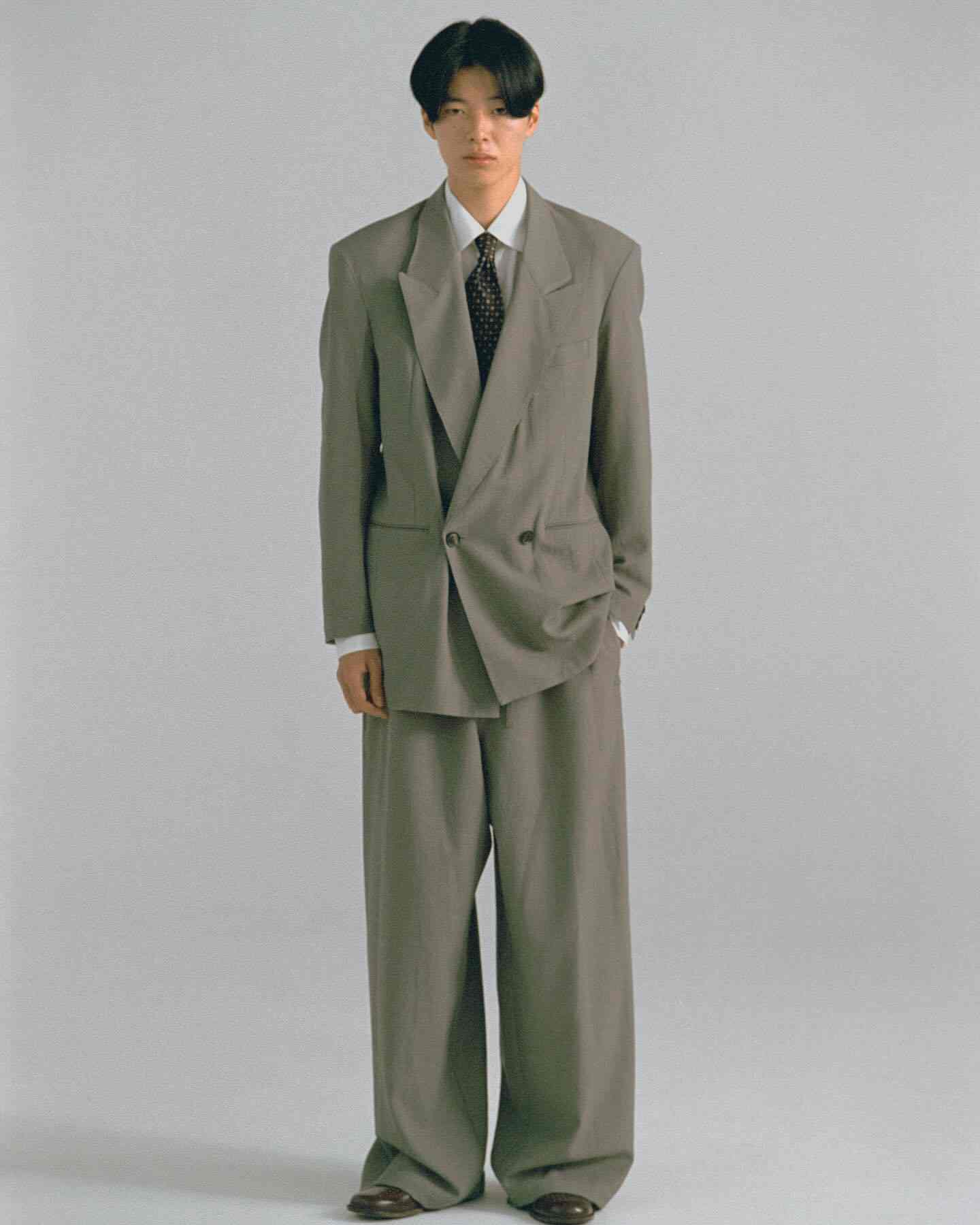 从 2024 秋冬系列开始 SOSHIOTSUKI 就将目光放到了日本本土的不同时代服饰氛围中来,而在不久前曝光的 2025 春夏系列则体现的更为明显,将日本上世纪 80~90 年代泡沫经济时期的男性着装风貌真实再现,宽大但稍显不合身的驳领西装,同样宽松盖住皮鞋多半个鞋面的西裤等等单品都十分传神,这种于当下审美语境中稍显局促的细节设定更具年代感,也在侧面展现了上世纪文艺黄金时代里男性对于服饰的诉求与真实细节。