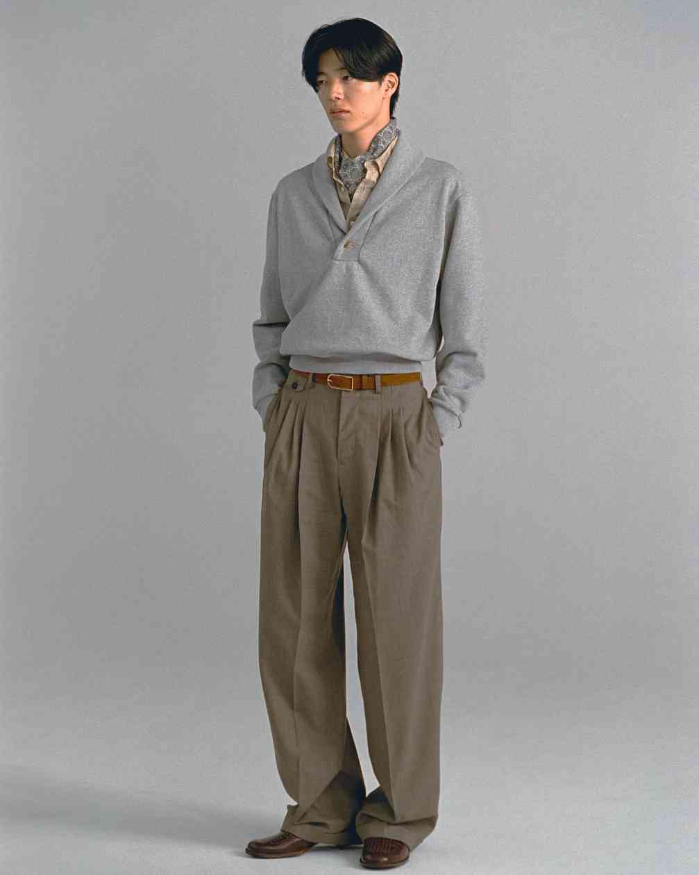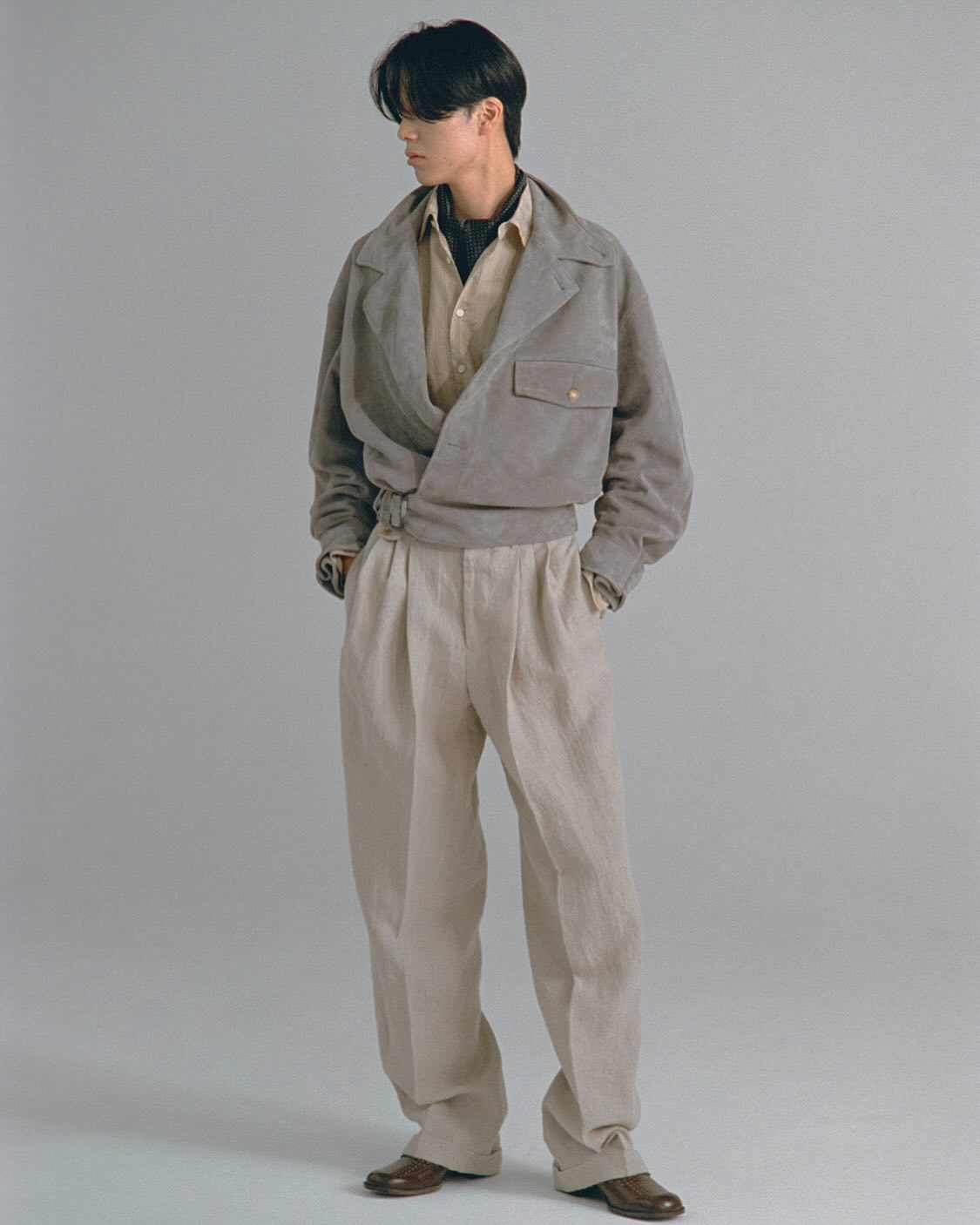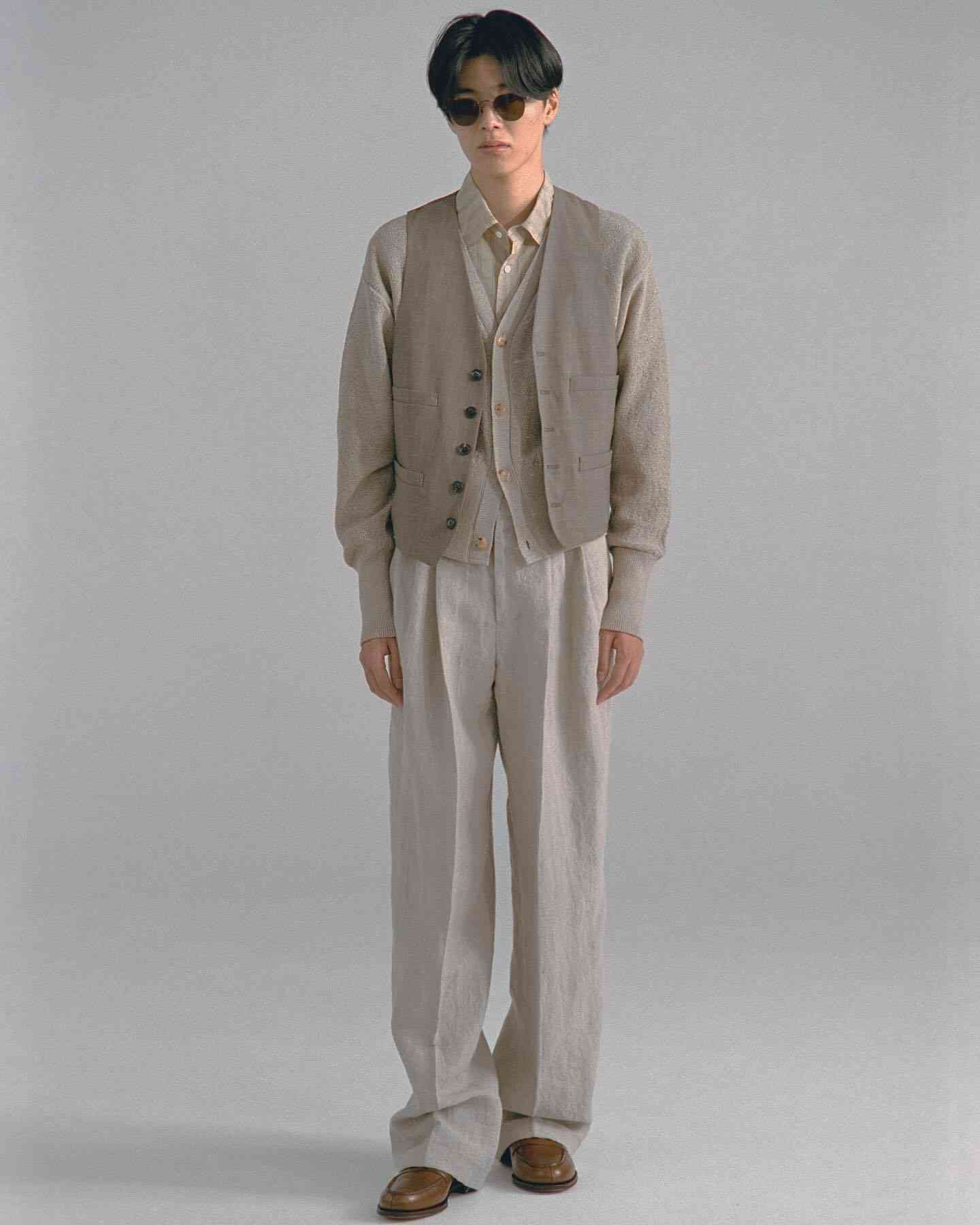 从 2024 秋冬系列开始 SOSHIOTSUKI 就将目光放到了日本本土的不同时代服饰氛围中来,而在不久前曝光的 2025 春夏系列则体现的更为明显,将日本上世纪 80~90 年代泡沫经济时期的男性着装风貌真实再现,宽大但稍显不合身的驳领西装,同样宽松盖住皮鞋多半个鞋面的西裤等等单品都十分传神,这种于当下审美语境中稍显局促的细节设定更具年代感,也在侧面展现了上世纪文艺黄金时代里男性对于服饰的诉求与真实细节。