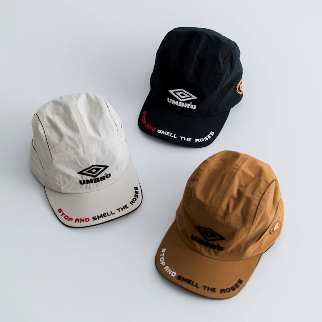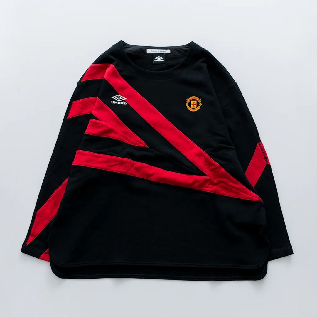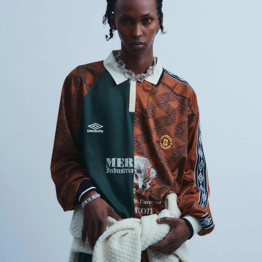 深入人心的经典 Umbro 回形 Logo、足球运动衫,以随意但极具视觉冲击力的方式排布;明暗、花色、颜色不一的不对称拼接手法,将带有强烈足球美学符号的标识性元素,呈现出兼具复古视感和前卫先锋时尚意境的新面貌。