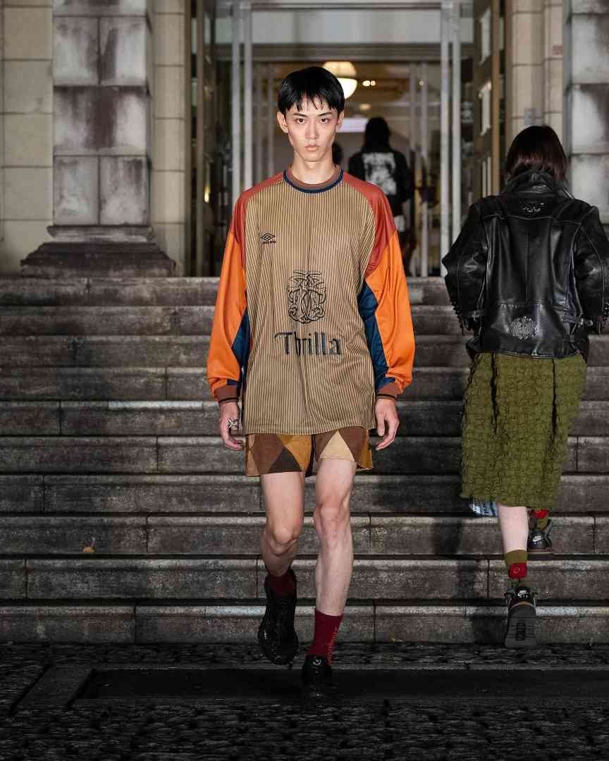 说他「陈旧」,是因为整季中最吸睛的作品,均来自基于 Umbro 运动服、AKIRA Vintage Tee 等经典复古物品的再创设计。而称其年轻,则很直观的可以通过其 Gen-Z 式的先锋美学画风,和挣脱既定风格框架的 Bootleg 设计思路一眼看出。