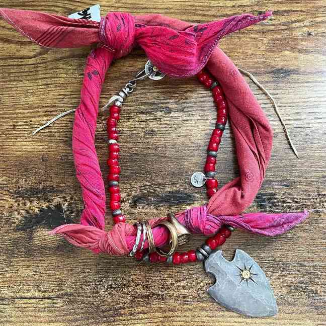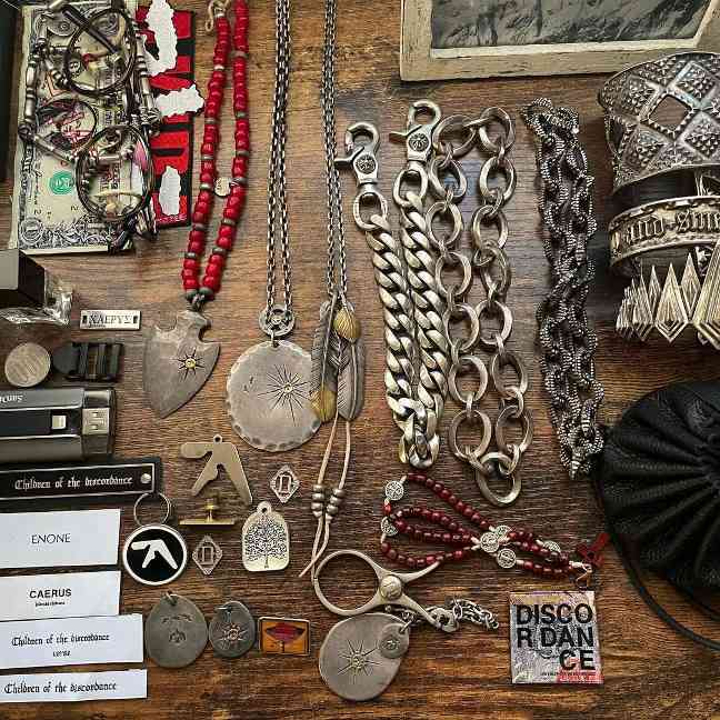 即便是诸如 Goro’s、Chrome Hearts 之类的银饰品牌,Hideaki Shikama 也能通过古布丝巾、串珠等物件与不同吊坠、戒指的随机组合,打造出跳脱品牌原有风格定式的、或民族风韵、或刚柔并济的融合感面貌。