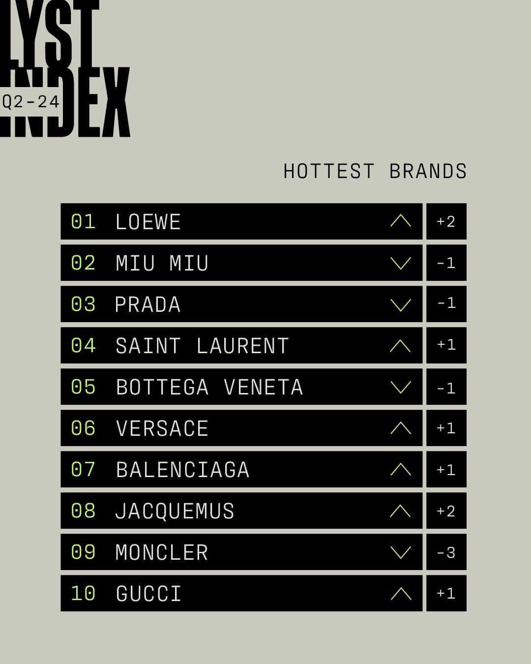 就在几天前,时尚数据机构与购物平台 LYST 正式发布了 2024 年第二季度的热门品牌榜单,LOEWE 风头正劲登顶榜首,意外的在 Miu Miu 和 PRADA 的持续超高人气下成功突围。