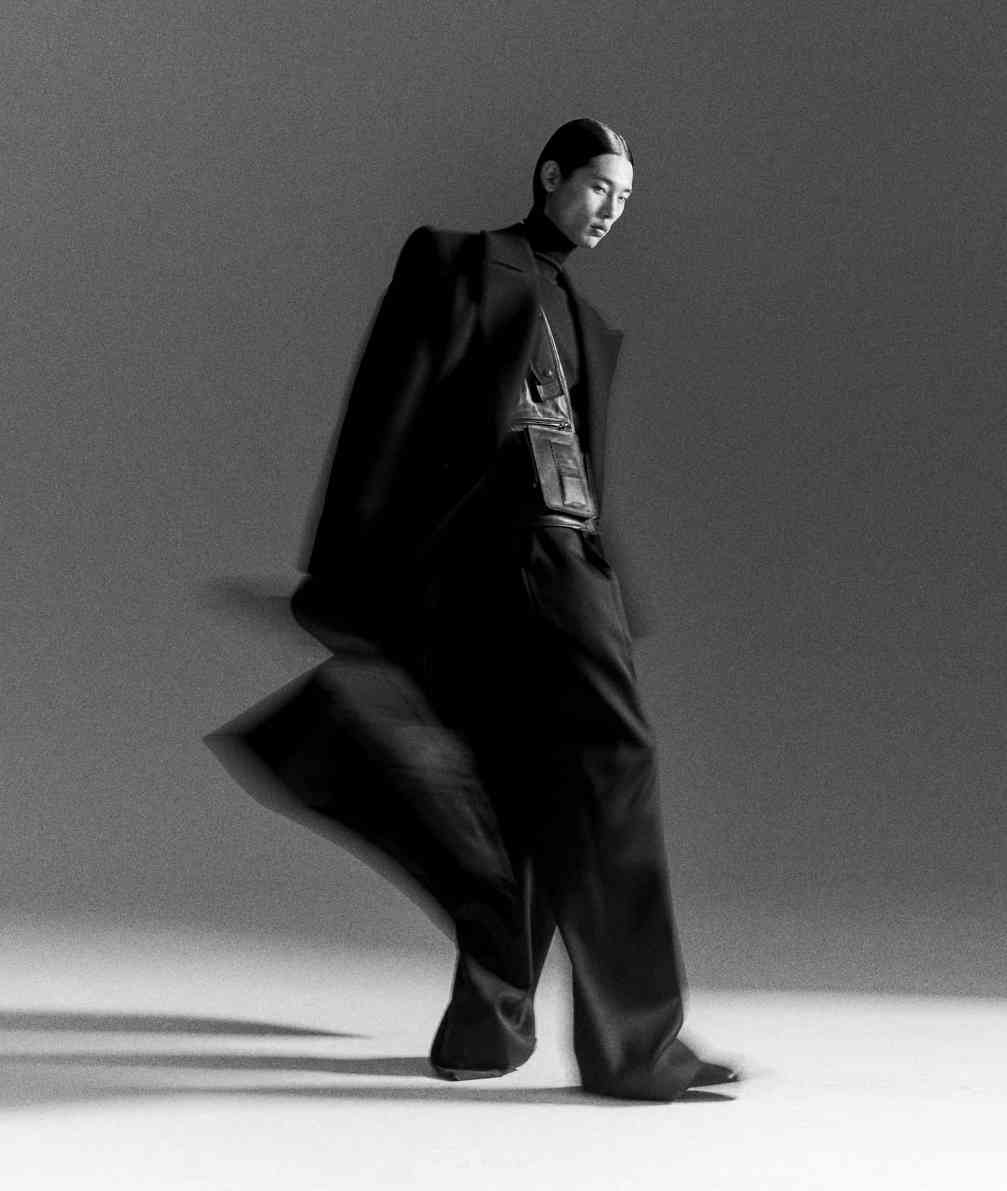 在 JUUN.J 的 2024 秋冬系列中品牌设计团队再次对于以往擅长的黑色给出了颇具层次感的诠释,军工装实验性的改造以及女装层面极简主义的呈现赋予整个系列极高的完成度与神秘感,尽管收起了尖锐的表达,但建筑感的线条仍旧搭建出超现实的体系性,譬如垫肩的西装、机车夹克以及双排扣大衣。