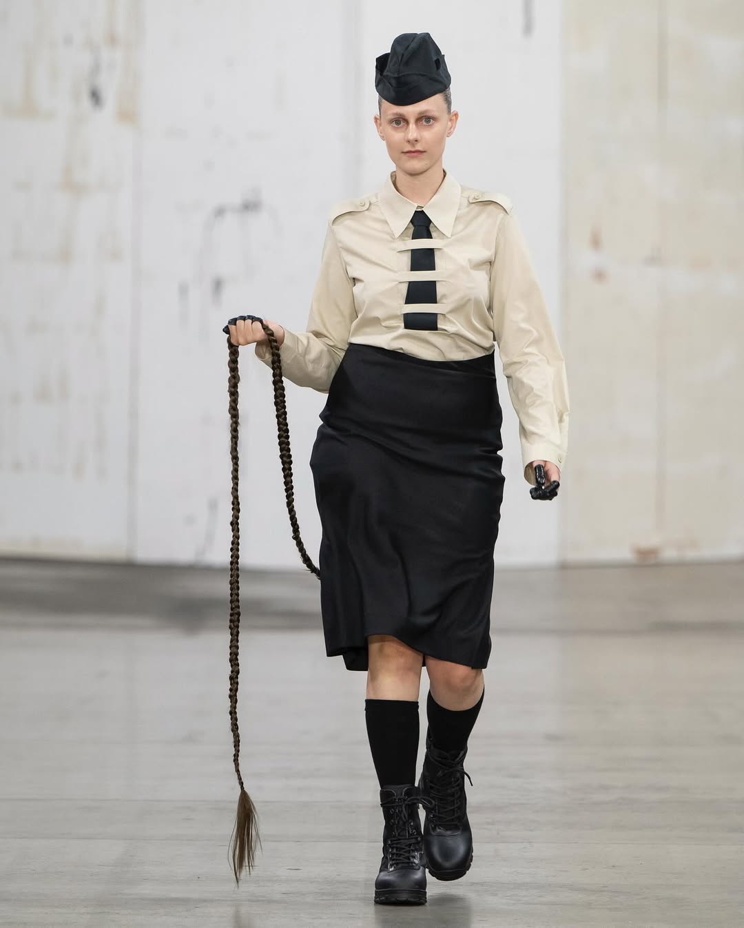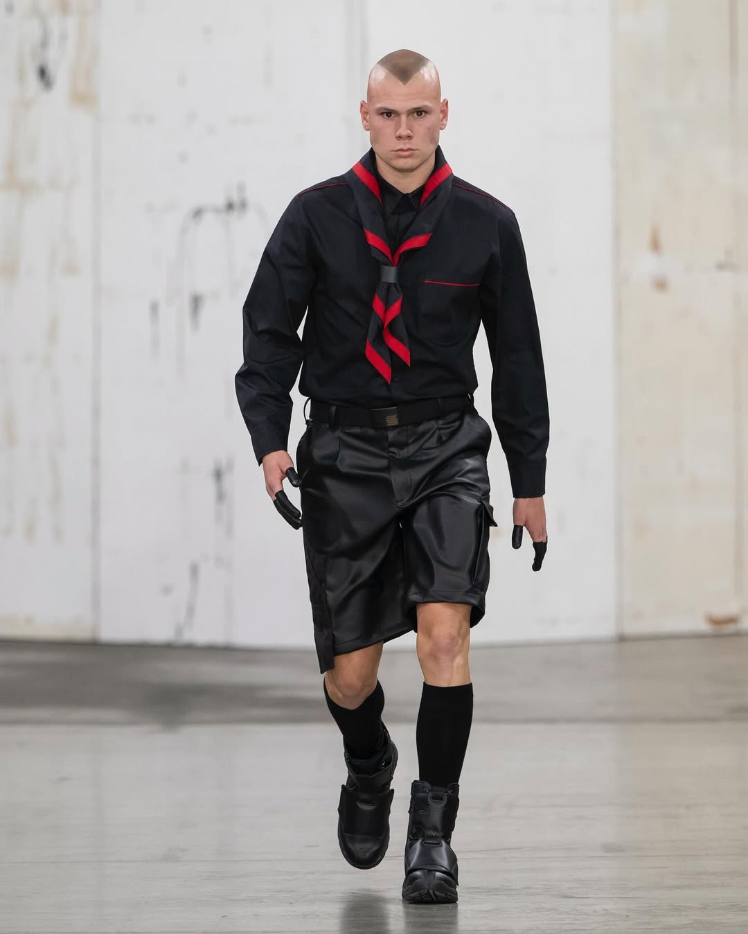 时尚如同「炼金术」,通过这一过程能将寻常的物品变成人们所渴望的追求对象。秀场上,模特们以空姐造型亮相,鞭子般的高马尾,领带被束缚在衬衫上,一些男童军短裤被设计成了软糖质感的皮革,另外还有镶满金属按扣的高腰渔夫裤。