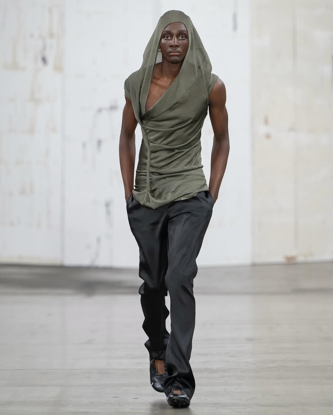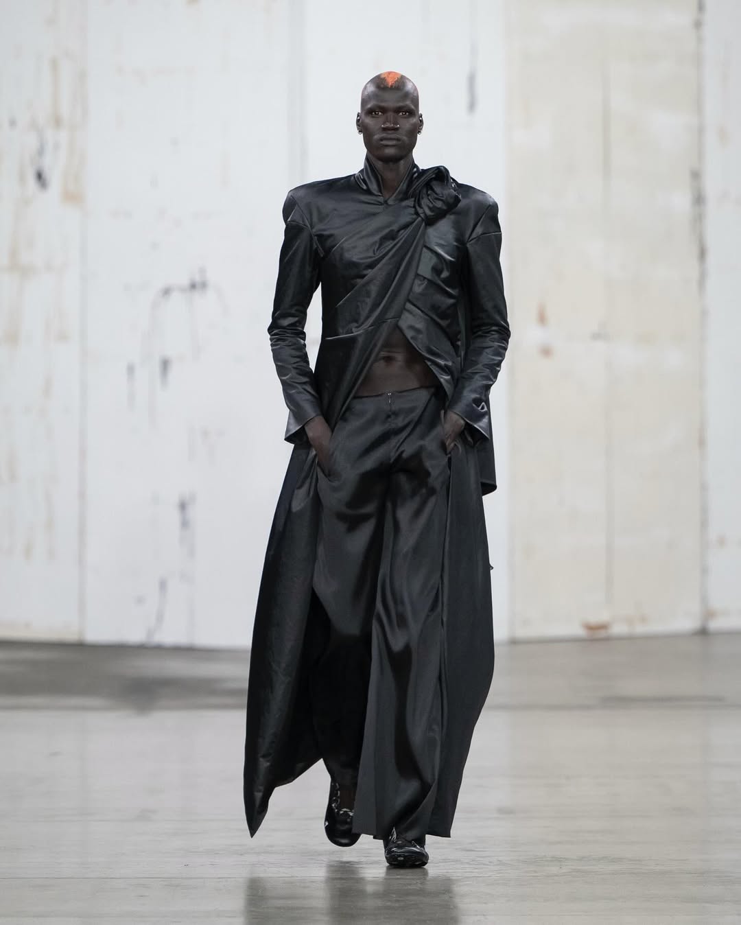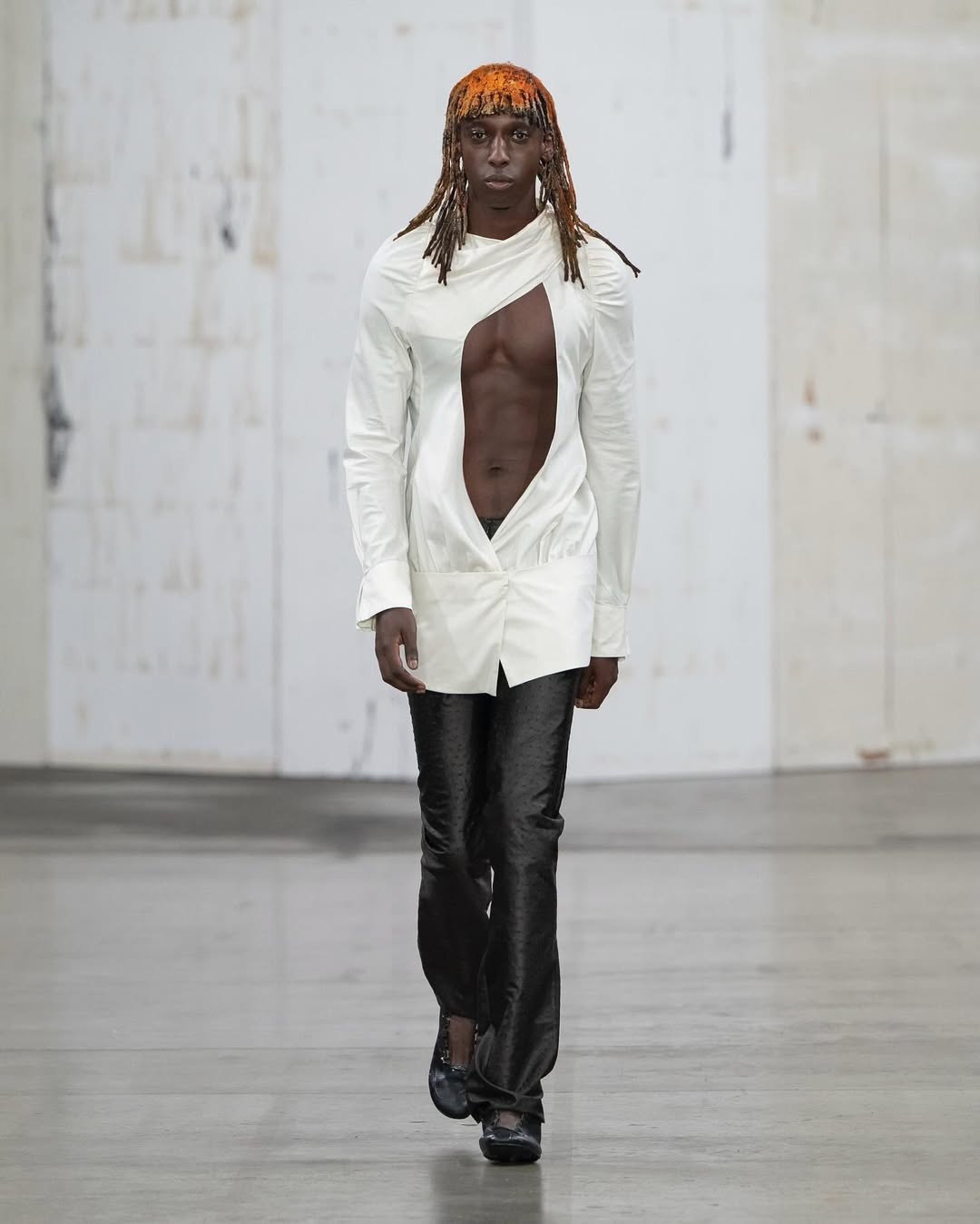 由 Cameron Williams 和 Jebi Labembika 创立的男装品牌 Nuba,本次首次被 Fashion East 选中,展示他们的 2025 春夏系列「SIM」。该系列的设计受到了伦敦、牙买加和喀麦隆的地理文化影响,例如飘逸的兜帽、皮革芭蕾舞平底鞋和结构化的肩部设计,衬衫和上衣在胸口处大胆地开口等,都体现出个性化的风格表达。