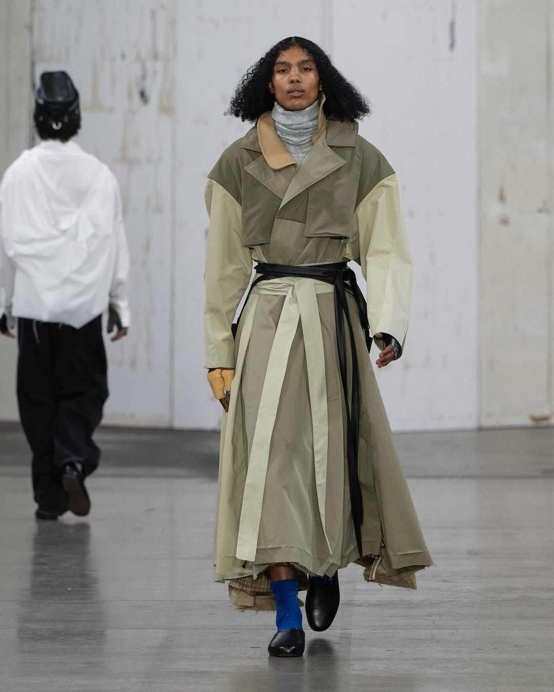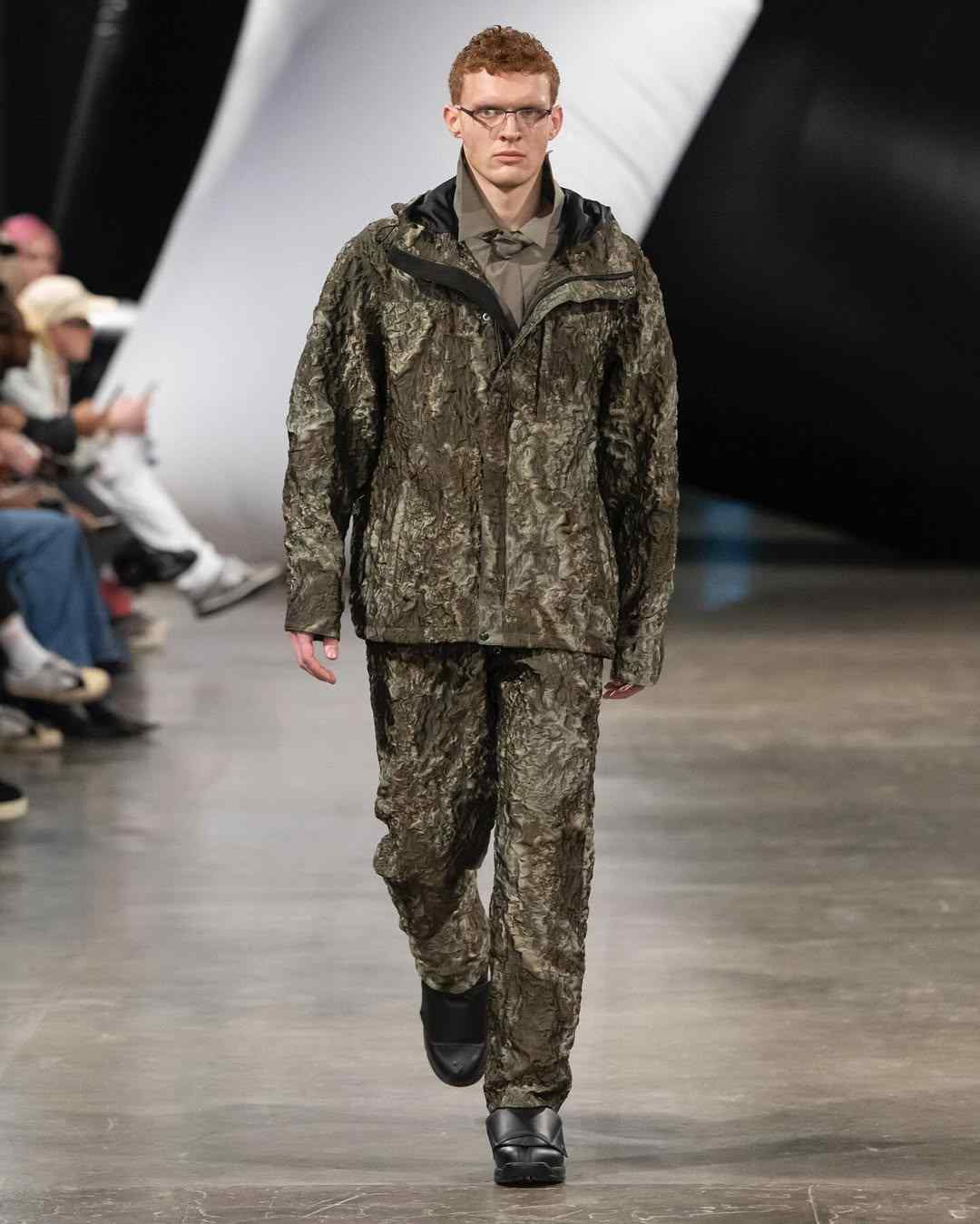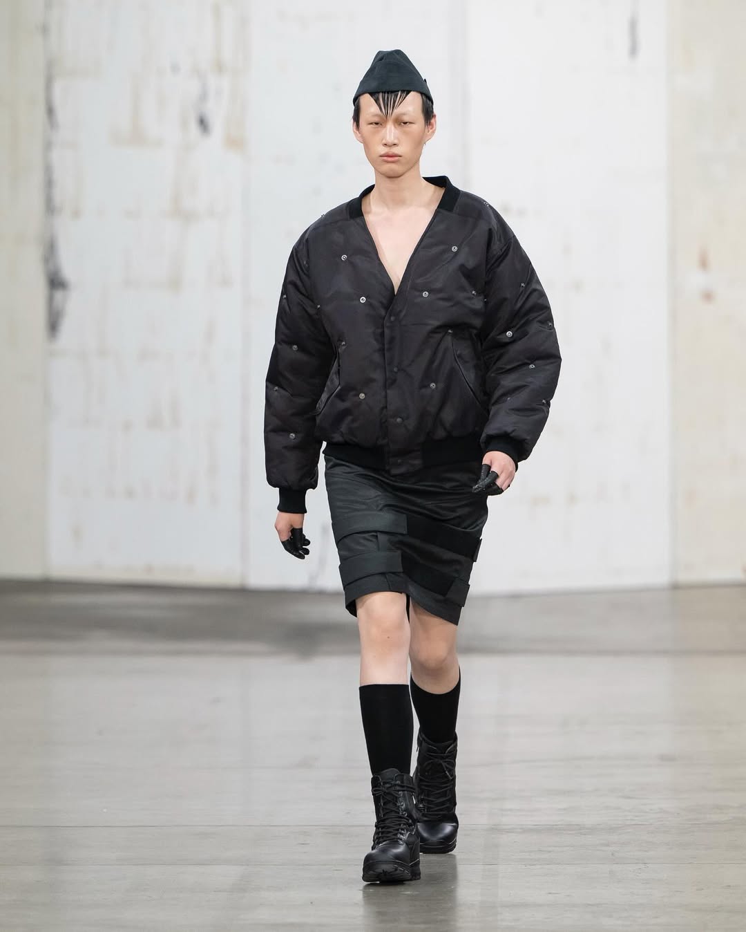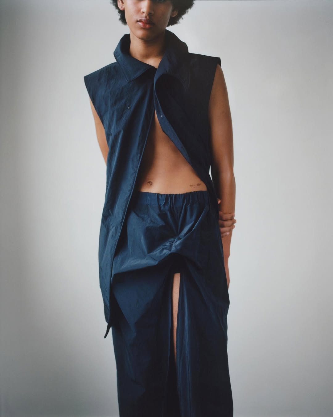 年仅 24 岁的 Olly Shinder 于 2022 年在中央圣马丁学院毕业,随后开启了他的时尚设计生涯。设计上, Shinder 深受户外服装、军装及功能性服装影响,通过对男装的独特理解以及性别模糊化的首发,构建出一种非常新颖的风格体系。