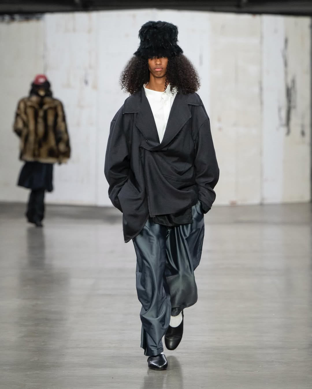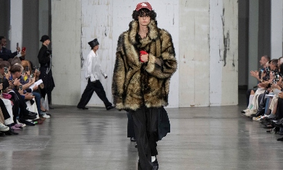 秀场上,模特们身着宽大风衣,用手夹着随身物品,服装在层次与材质的碰撞中展现出丰富的视觉效果。其中,一件拼接的仿皮草大衣尤为引人注目,搭配一顶深红色帽子和修身烟管裤,展现出一种随意且酷炫的都市风格。