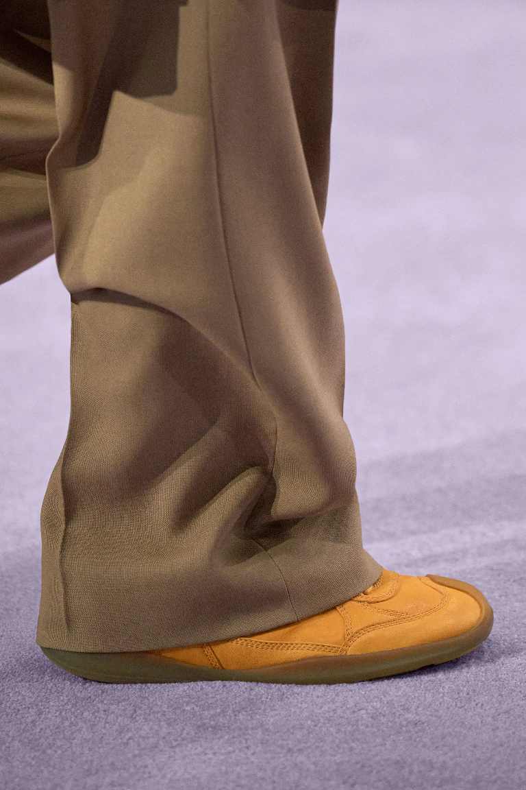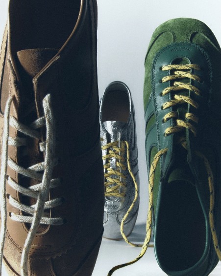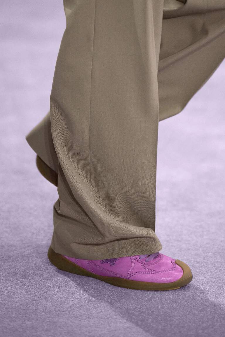 取自经典德训鞋的外观特征,在包边鞋头、鞋侧线条等位置清晰可见;Dries Van Noten 则是通过更为扁平的轮廓改动、更具高级质感的麂皮材料运用,以及更丰富且典雅的色调选用,来为其增添更具时装内涵灵魂的迷人观感。