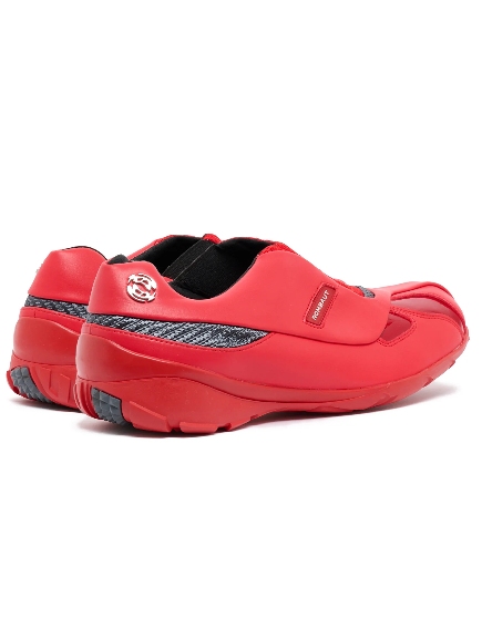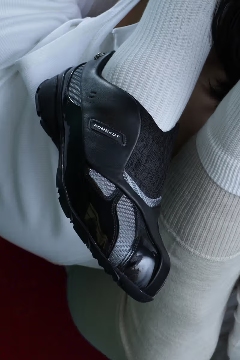 除此之外,本季中另一款拥有相似鞋面模块和鞋身轮廓的改款作品,也颇为抓人眼球。Raf 老粉都不会陌生的「铁头」模块,被加入到这双新鞋款的鞋头位置,相比原版简练流畅的外观效果,这双「铁头款」薄底鞋在视觉冲击力、辨识度元素上等方面,也有着自身独特优势。