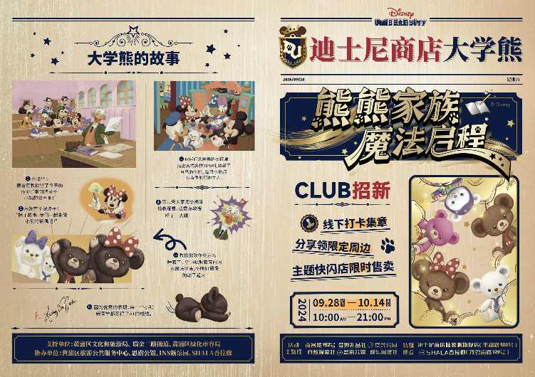 但惊喜不止于此,为庆祝大学熊系列上线,从 9 月 28 日至 10 月 14 日,迪士尼的「熊熊家族 魔法启程」主题活动「空降」上海黄浦区,活动路线覆盖南昌路 152 号—复兴公园—思南公馆,打造多个站点为粉丝和消费者带来一场沉浸式的魔法 City Walk 之行。现场设置了领取打卡报刊和盖章等互动环节,更有可爱俏皮的大学熊装置等候大家前来体验。与此同时,只要在当日完成这一系列的地图打卡,集章完成,便可免费领取定制奖品。