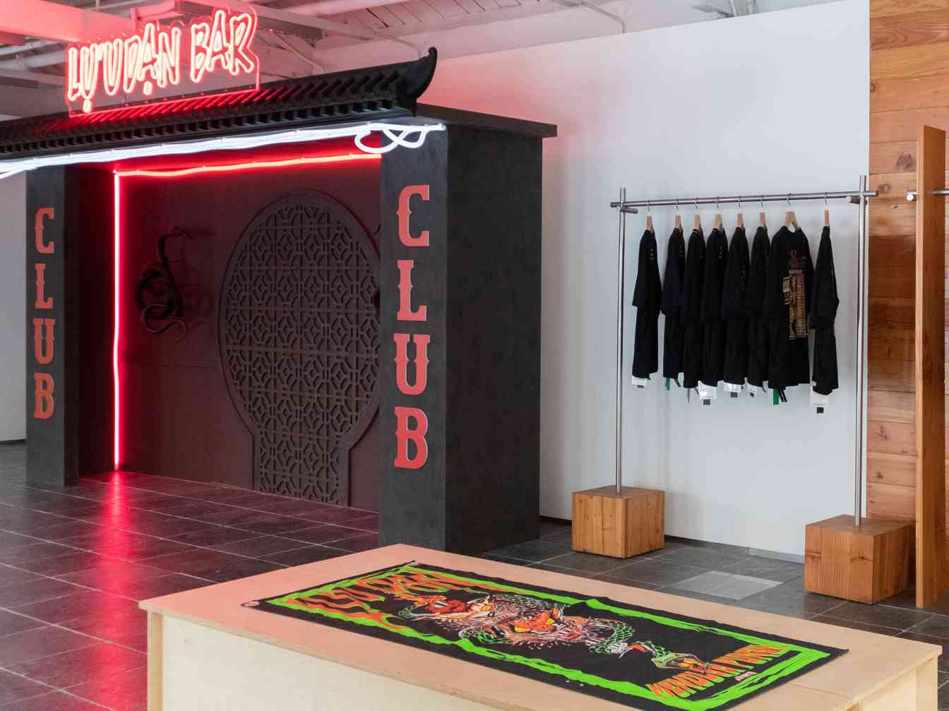 这次的空间主题是「LU’U DAN NEON HAZE」,灵感来源于 Greg Girard 拍摄的 20 世纪 70 年代的香港影像。这么做是因为我想还原亚洲的夜生活——那种出去玩、打扮得很精致的感觉。站在时尚的角度去看,怀旧氛围虽「源于过去」,却仍与当今文化息息相关。