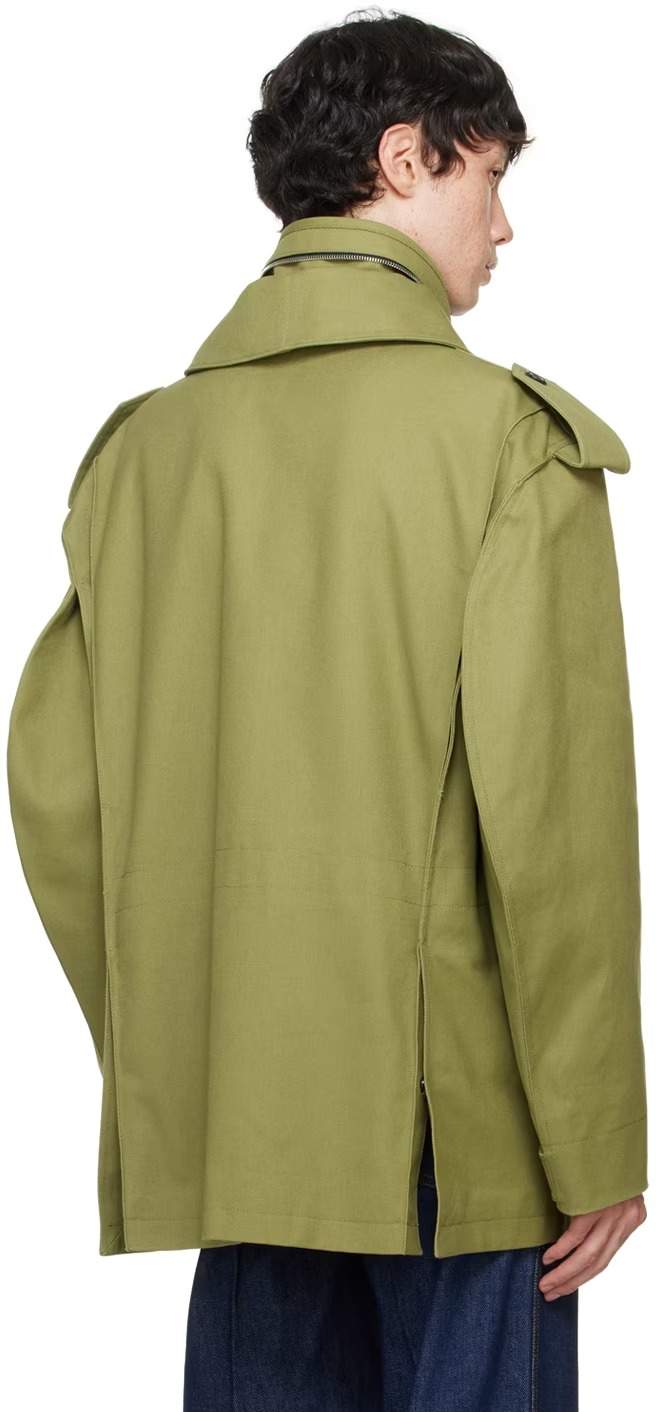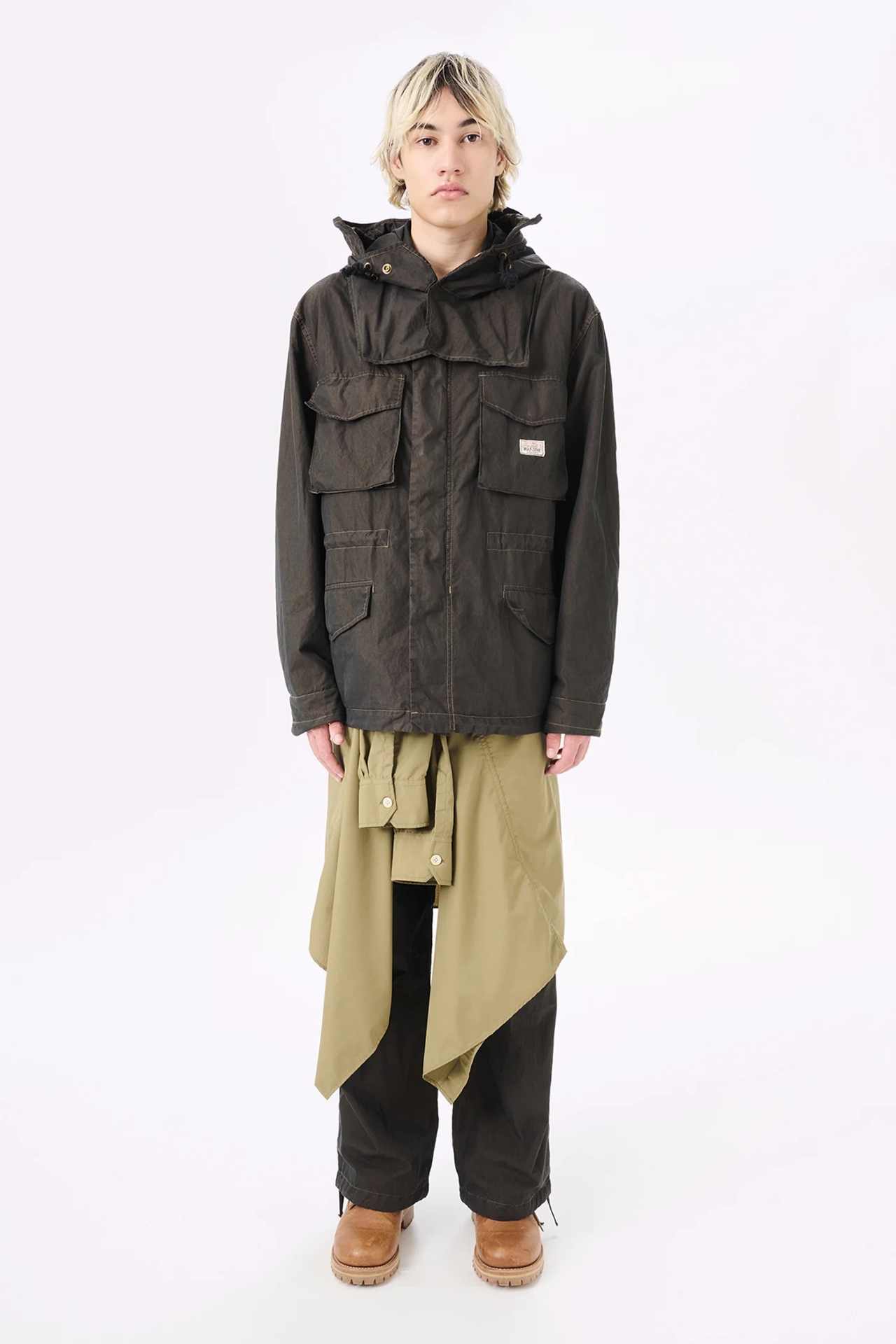 从官方命名以及标志性的喉袢结构可以推测其原型为法国军队在 1947 年开始采用的 M-47 型号,但领口结构进行较大的改动,融入了 M-65 的拉链细节,并通过拉链巧妙形成双领口结构。从正面看整体剪裁似乎并没有发生多少变化,仅仅是将肩带做出超出肩线的处理,以削减传统军装的严肃感。而来到后面就会发现「别有洞天」—— 袖笼做出了弧形剪裁;后片也没有循规蹈矩在腋下进行缝合,而是采用梯形裁片将车线位置移到了后背,获得了极具动感的立体效果。