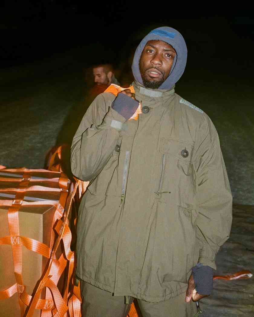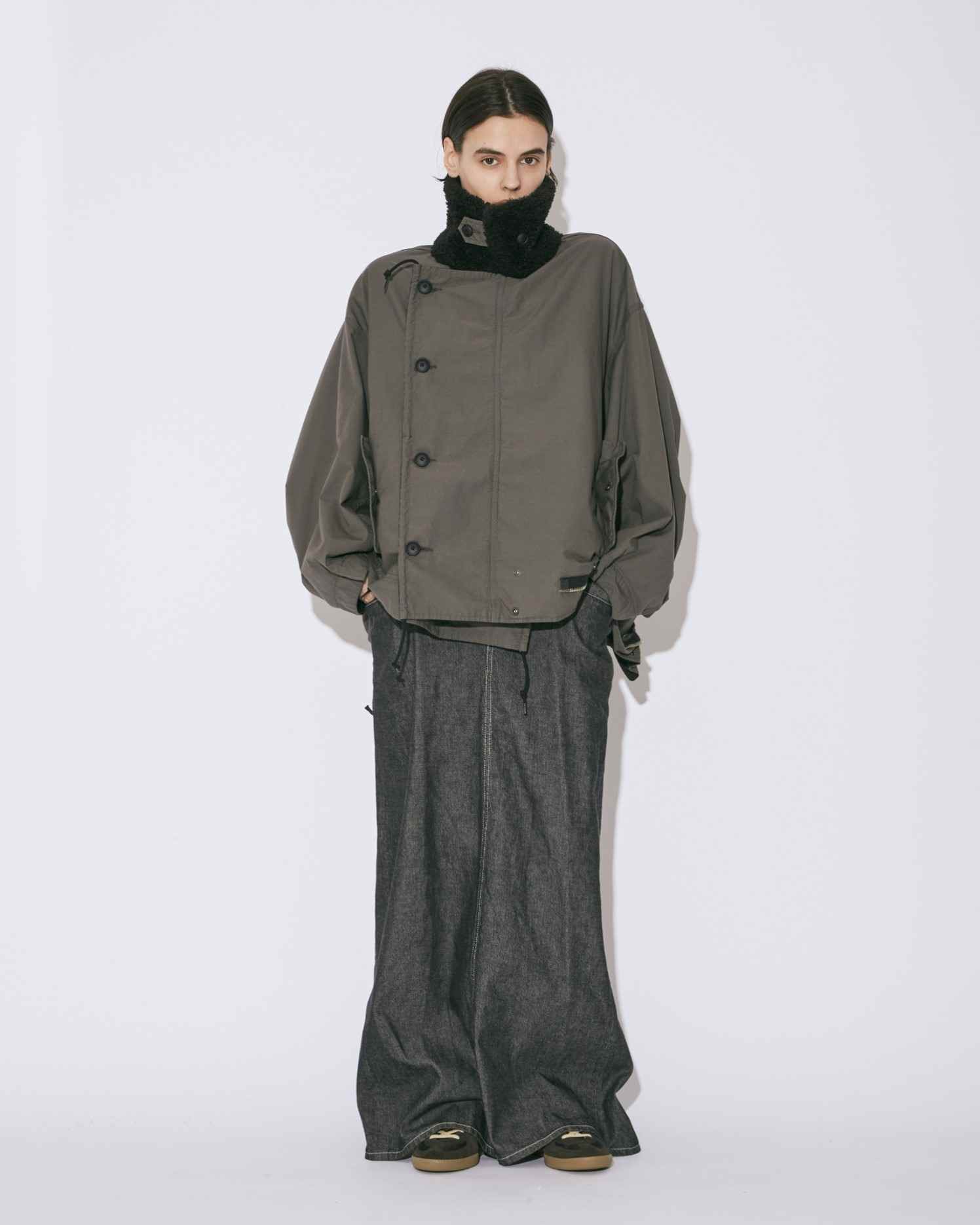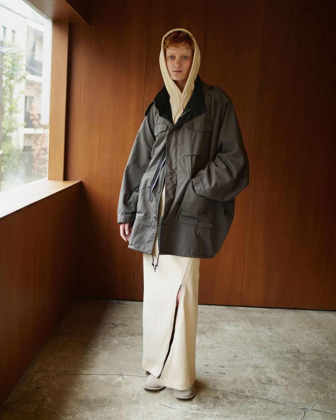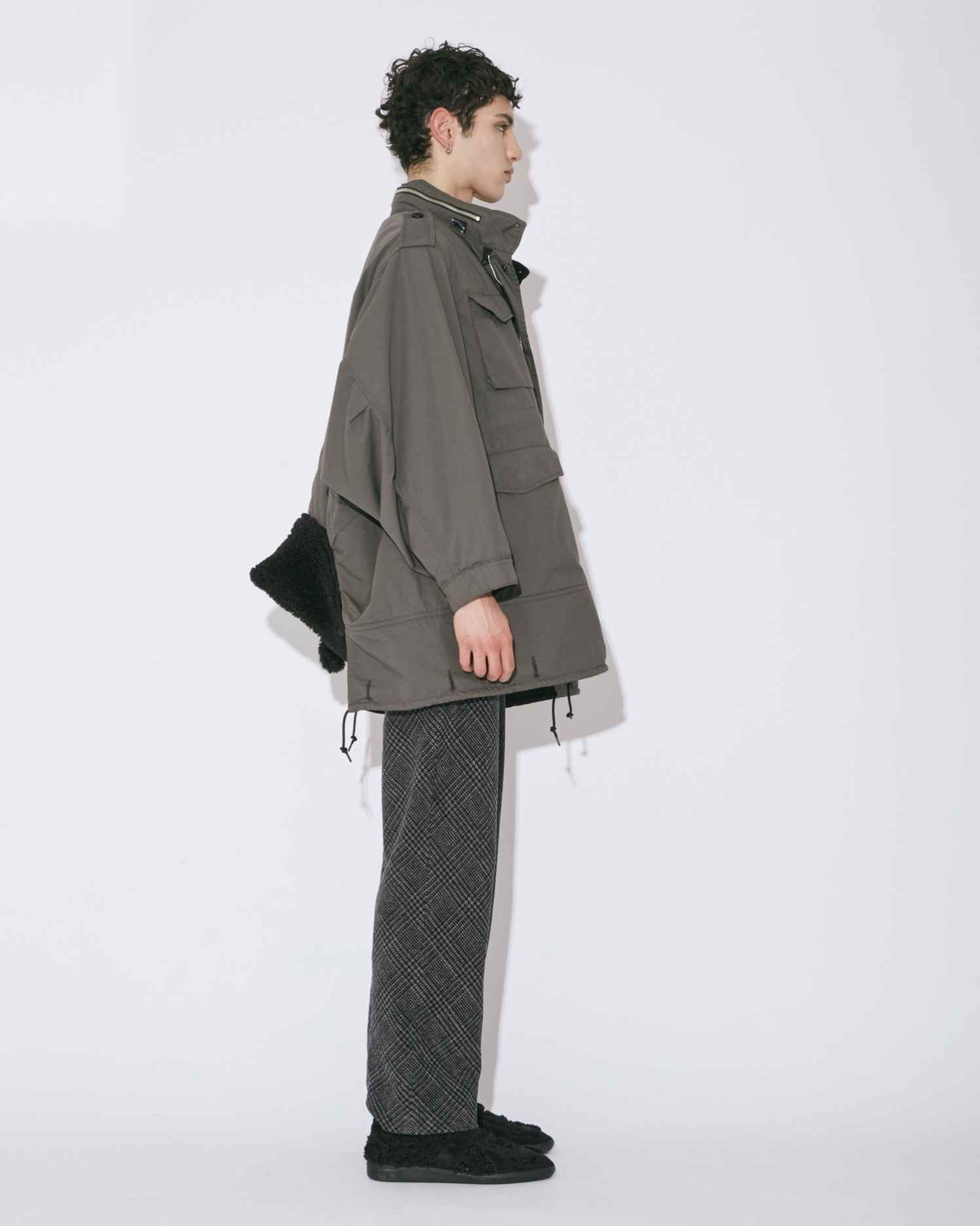 N.HOOLYWOOD 旗下军事风格支线 TEST PRODUCT EXCHANGE SERVICE 在 2024 秋冬系列中推出的服饰均以极寒环境为背景搭建,因此参考了大量瑞典军队装备,结合现代面料打造出了使用时装语言叙述的功能性服饰。