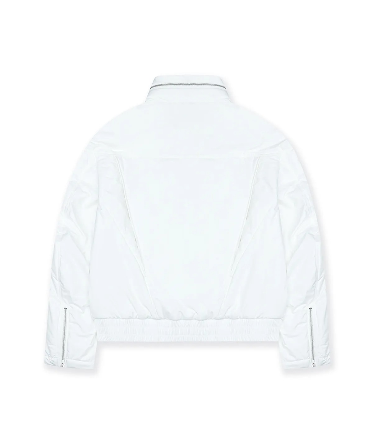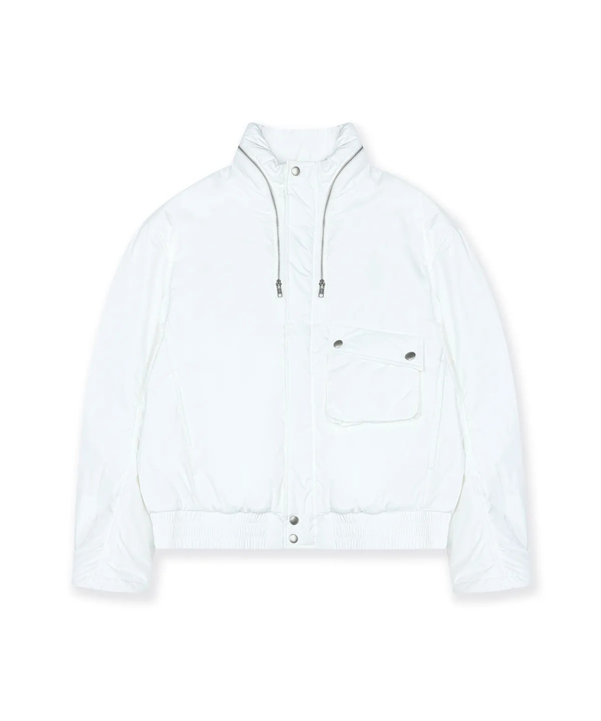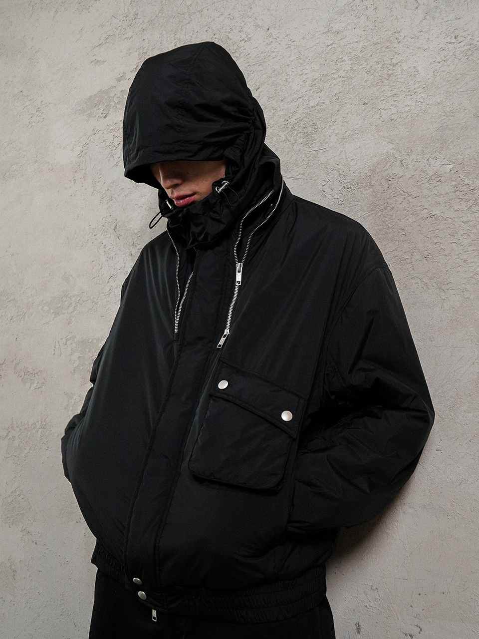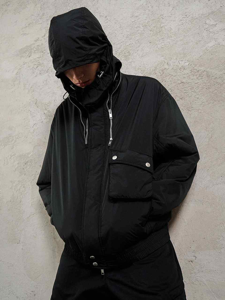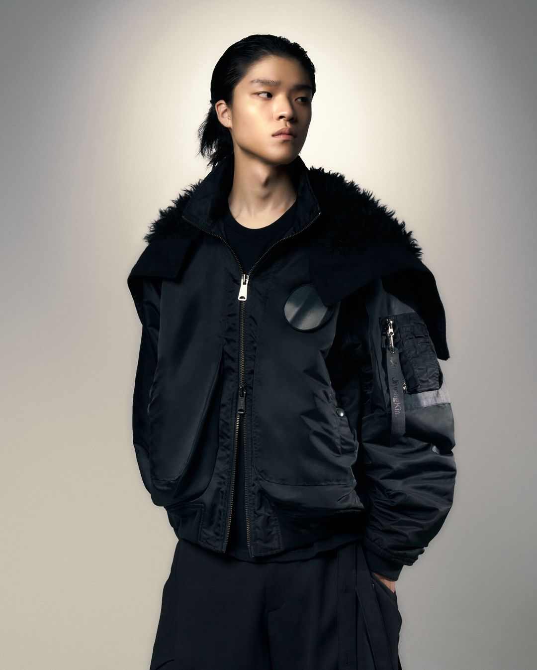 在 N-2B 夹克上原有的基础上, JiyongKim 也进行了大量贴近现代设计语言的改动:原版的插肩袖设计很容易造成肩部的臃肿,被替换为正肩设计;增加内层立领,可以通过拉链完全闭合领口,原本的皮毛帽子转而使用分离式设计;为了避免正面设计元素过于单调,还为口袋做出了立体结构,车线一直延伸至领口处,巧妙地提升了层次感。