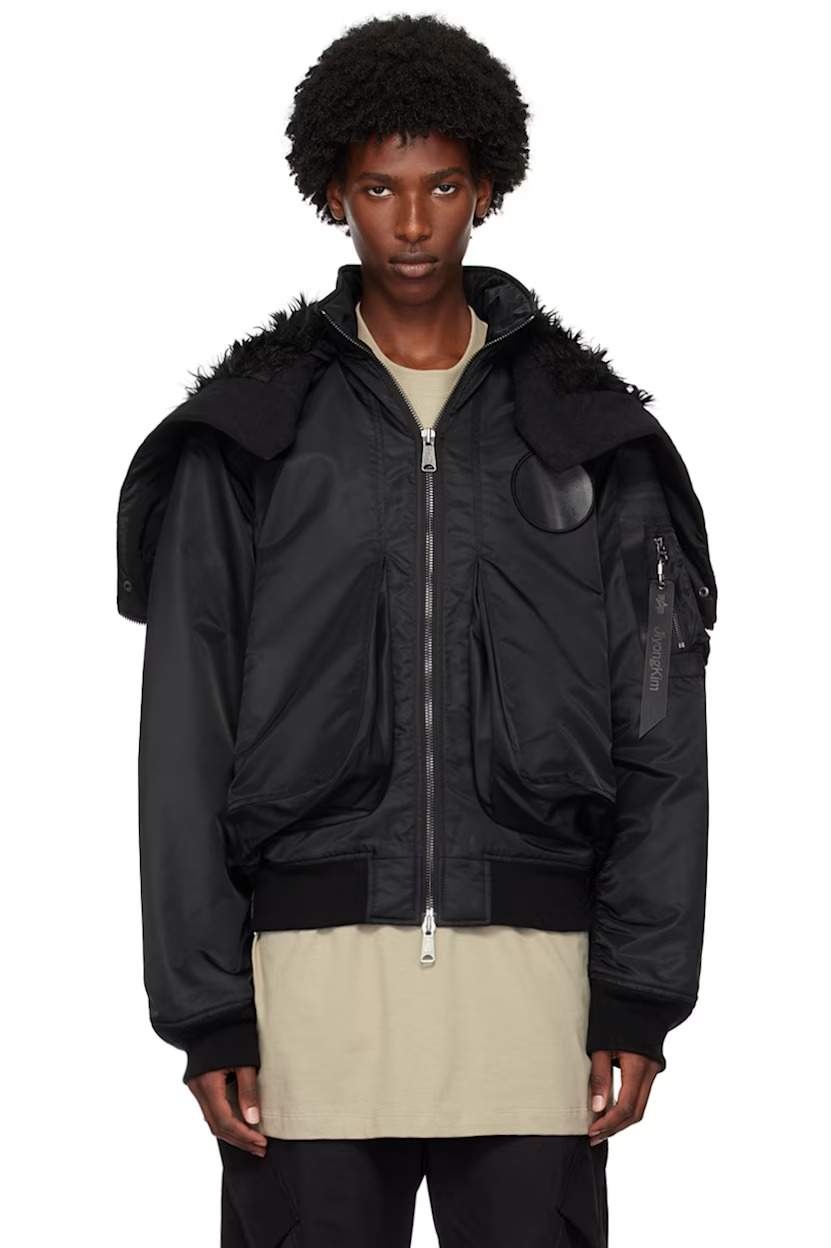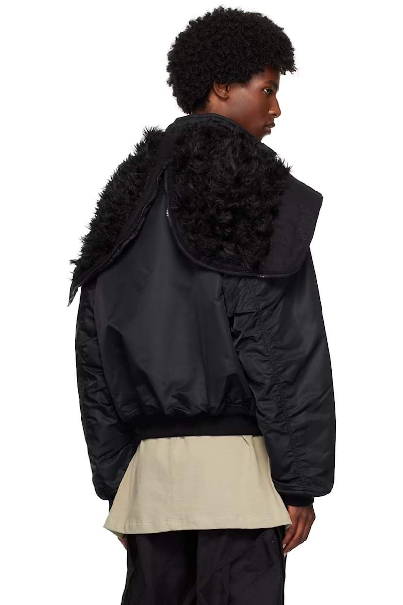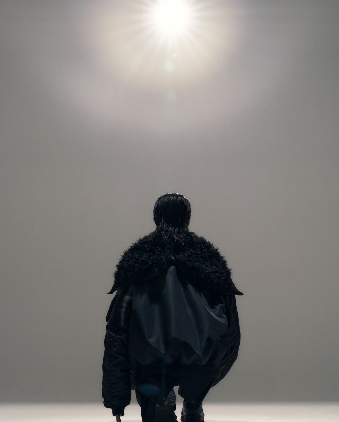 在此前多篇文章中都有提及,JiyongKim 名片式的日晒漂白工艺及其带来的独一无二性想必不用再赘述。与 Alpha Industries 的第二次合作选择 N-2B 飞行员夹克作为蓝本,整体使用黑色进行渲染,原本军事风格单品在视觉上所具备的攻击性被转化为优雅清冷气质,同时也将胸口和袖子上经过日晒处理的裁片衬托得更加明显。
