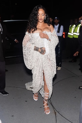 而在 9 月刚刚举办的 2025 冬春系列大秀也吸引了不少关注。一方面这是古根海姆博物馆首次举办时装秀,也是 Alaïa 自上世纪 80 年代以首次回归纽约,让这场大秀备受瞩目。另一方面到场的前排明星也足够看点,其中 Rihanna 身着 Alaïa 无肩带渔网礼服裙亮相,帮助品牌成为了时尚新闻中的头条。