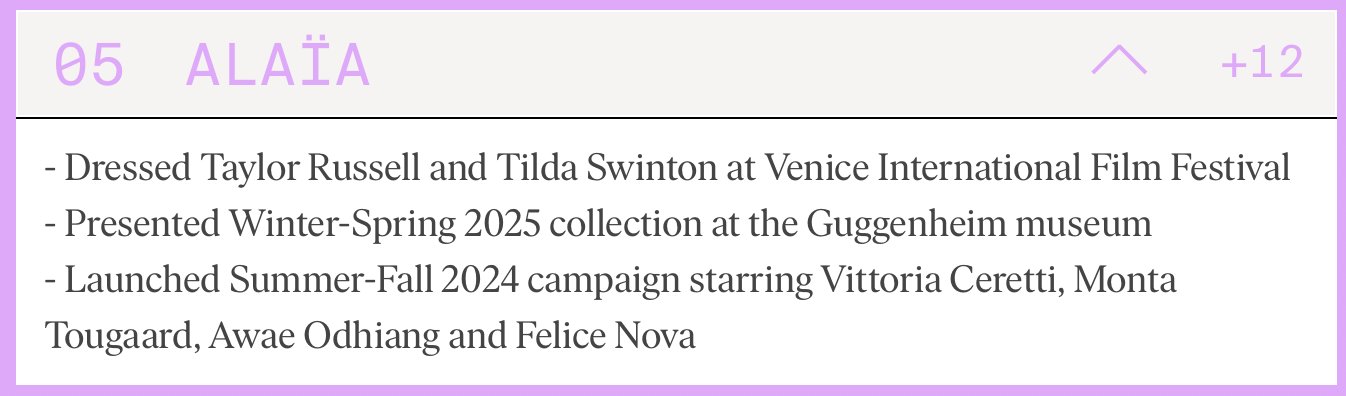 这也不免让很多人开始关注,Alaïa 是如何做到成功突围的,关于这点 LYST 在总结时给出了比较具有参考性的一些亮点事件。