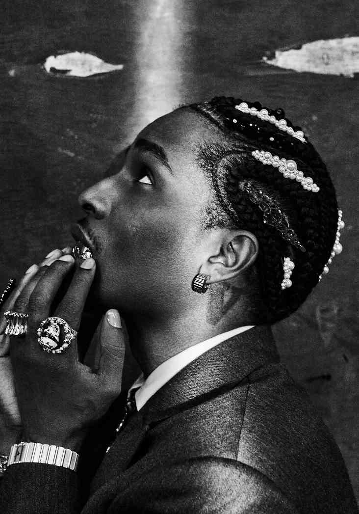 另一边的 A$AP ROCKY 在此前 Coachella 音乐节中以十分醒目的定制珍珠配饰作为演出的造型重心,从头饰到项链再到戒指均由质感不俗的珍珠定制打造,在这之后被一众信徒纷纷效仿,甚至提炼总结出「Coachella Fit」穿搭风格,浓郁的女性化轮廓珍珠配饰在 A$AP ROCKY 的演绎下呈现出精致雅痞的中性街头氛围,珍珠配饰在「顶男」语境中的受欢迎程度被推向一个小高潮。