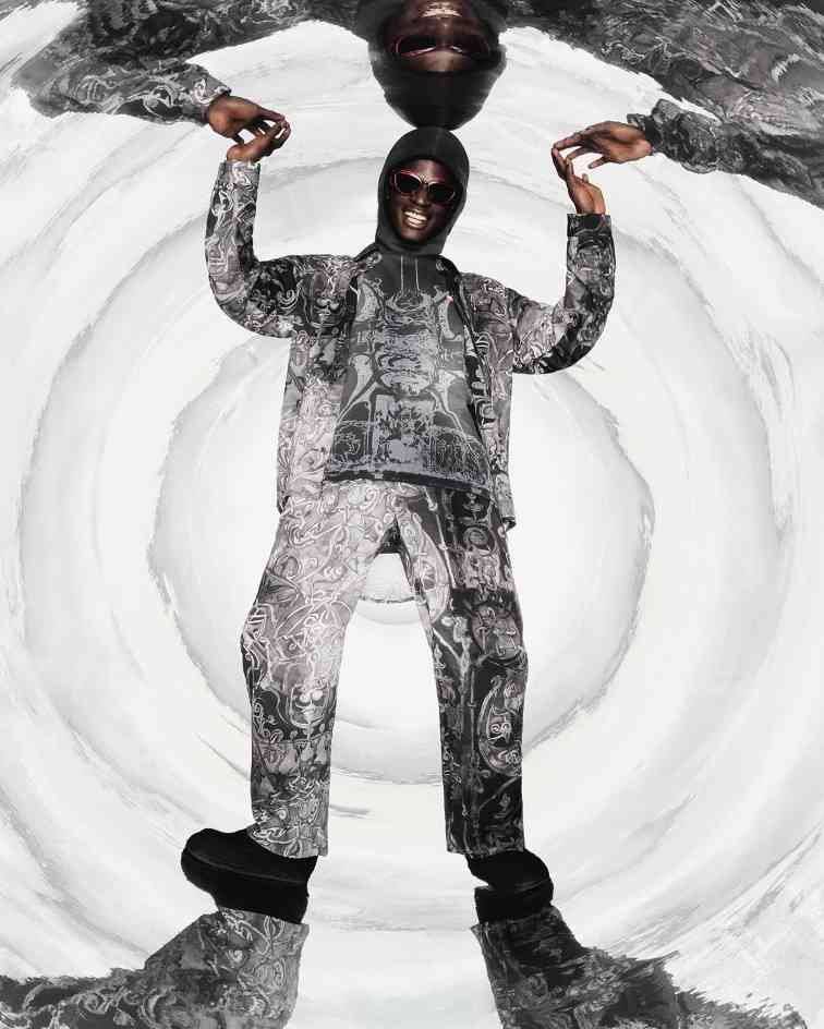 曾帮助品牌翻身回潮的「Dirty Fit」画风脏破元素设计,在本季中以更加肆意和激进的形式加码呈现:铺满全屏幕可见范围的通体糜烂、好似从「战场」归来的脏污不堪,出现在多件主打单品之中。